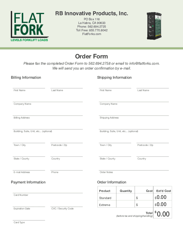 Platforms. Camcorder Formulas fax the completed Order Form to 562.694.2758 or email to info@flatforks.com.
