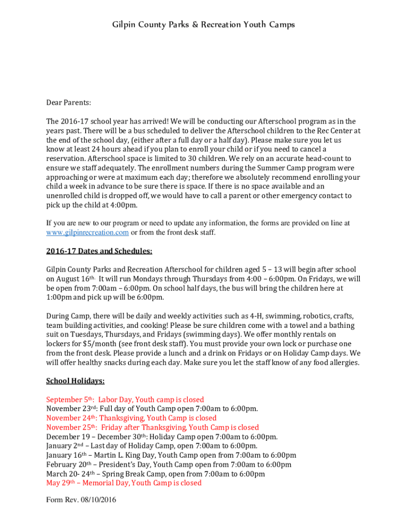 Gil pin County Parks & Recreation Youth Campier Parents:The 201617 school year has arrived! We will be conducting our After school program as in the years past. There will be a bus scheduled to deliver