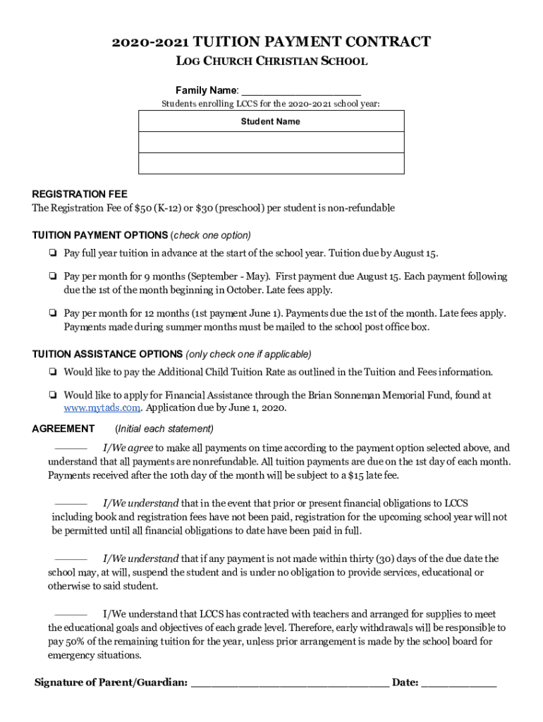 20202021 TUITION PAYMENT CONTRACT LOG CHURCH CHRISTIAN SCHOOL Family Names: Students enrolling CCS for the 20202021 school year: Student Preregistration FEE The Registration Fee of $50 (K12) or $30