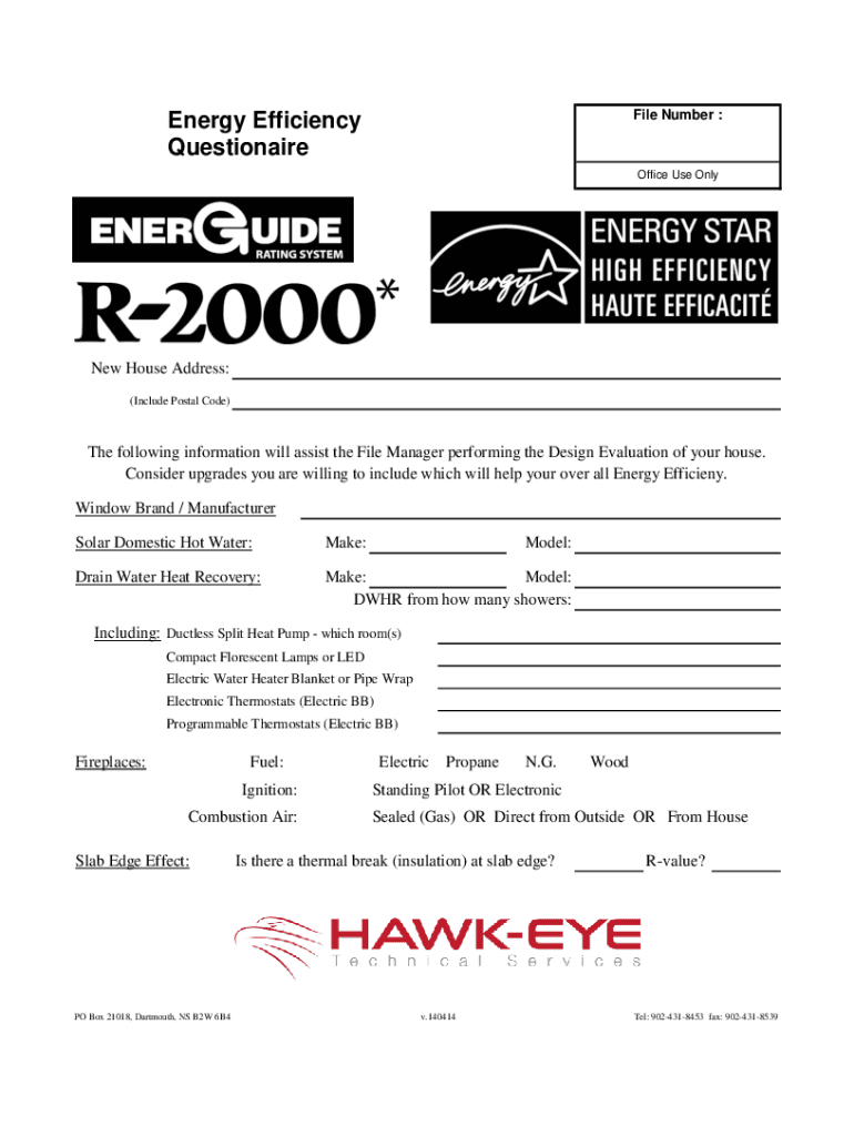 File Number :Energy Efficiency QuestionaireOffice Use Online House Address: (Include Postal Code)The following information will assist the File Manager performing the Design Evaluation of your house.