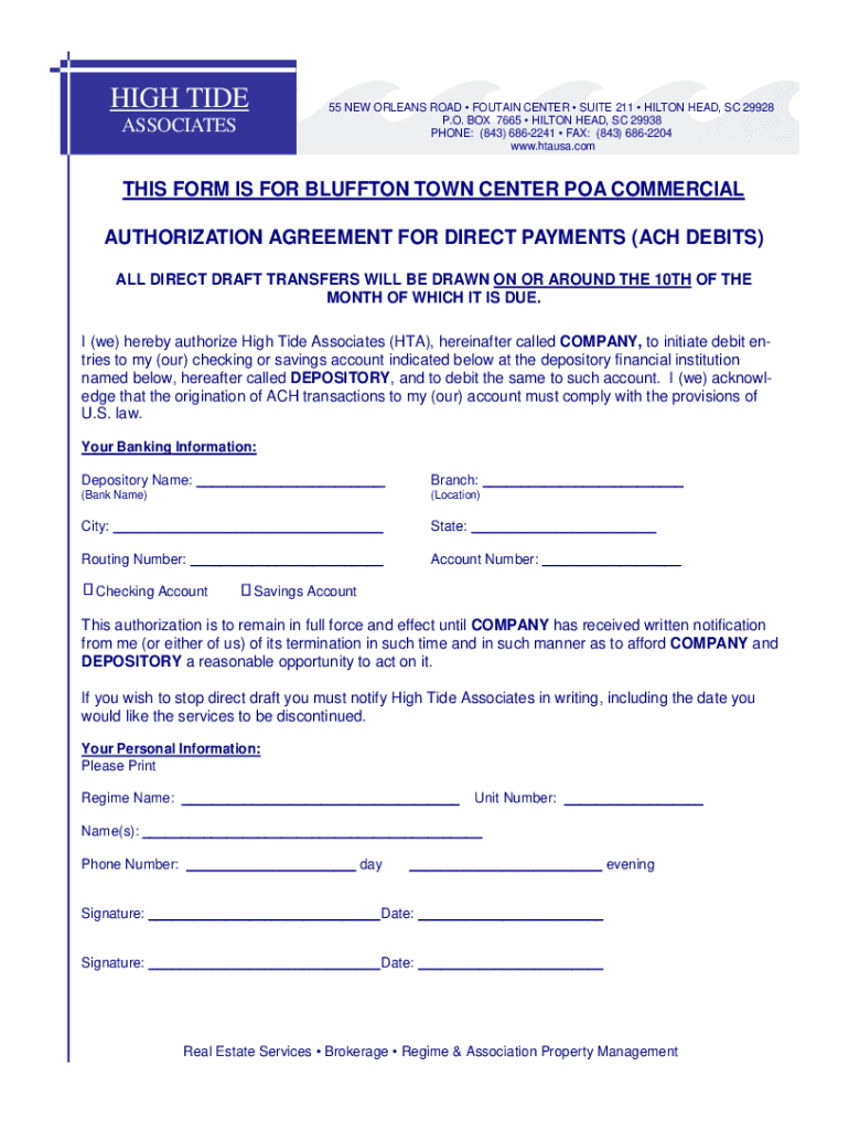 HIGH TIDE55 NEW ORLEANS ROAD FOUNTAIN CENTER SUITE 211 HILTON HEAD, SC 29928 P.O. BOX 7665 HILTON HEAD, SC 29938 PHONE: (843) 6862241 FAX: (843) 6862204 www.htausa.comASSOCIATESTHIS FORM IS FOR BLUFFTON