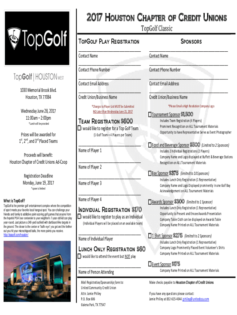 2017 Houston Chapter of Credit Unions 2013 Houston Chapter Tools Classic of Credit Unions Tools Play Registration Golf Tournament Sponsors1030 Memorial Brook Blvd. Houston, TX 77084 Wednesday, June