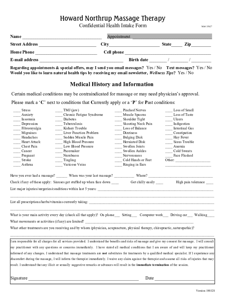 Howard Northrup Massage Therapy Confidential Health Intake Form Name MA# 35627Appointment Street Address City State Zip Home Phone Cell phone Email address Birth date / / Regarding appointments &