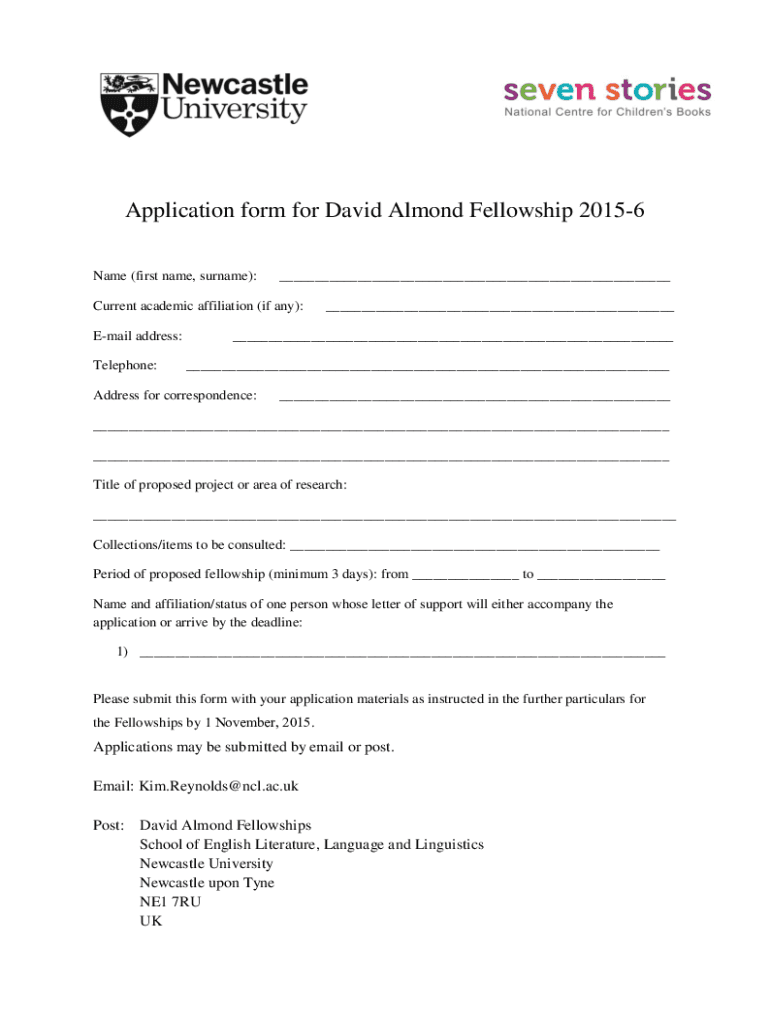 Get the free Application form for David Almond Fellowship 2015-6
