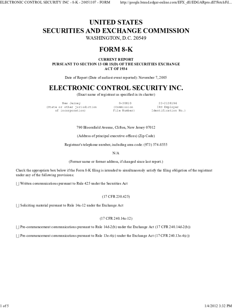 ELECTRONIC CONTROL SECURITY INC 8K 20051107 FORM1 of 5http://google.brand.edgaronline.com/EFX DLL/EDGARpro.dll? Fetch...UNITED STATES SECURITIES AND EXCHANGE COMMISSION WASHINGTON, D.C. 20549FORM
