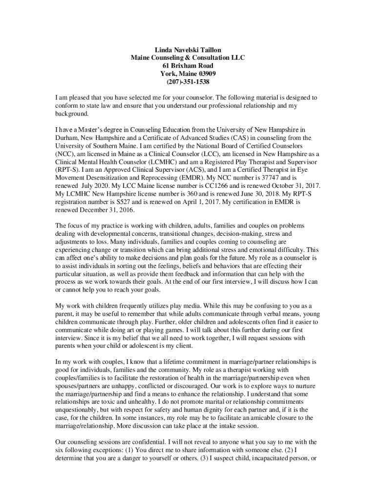 Linda Navel ski Dillon Maine Counseling & Consultation LLC 61 Brigham Road York, Maine 03909 (207)3511538 I am pleased that you have selected me for your counselor. The following material is designed