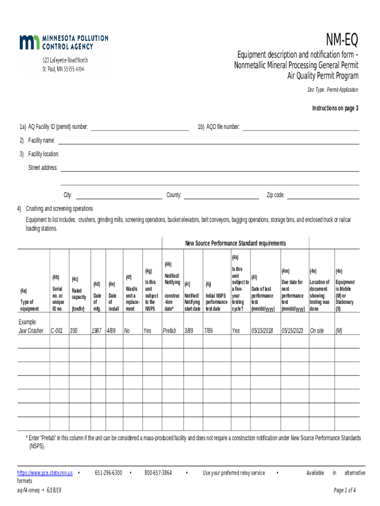 NM-EQ Equipment description and notification - Nonmetallic Mineral Processing General Permit, Air Quality Permit Program. used to describe equipment subject to the general permit template instructions