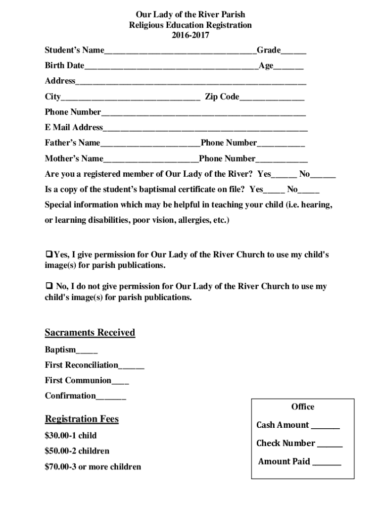 Our Lady of the River Parish Religious Education Registration 20162017 Students Name Grade Birth Date Age Address City Zip Code Phone Number E Mail Address Fathers Name Phone Number Mothers Name Phone