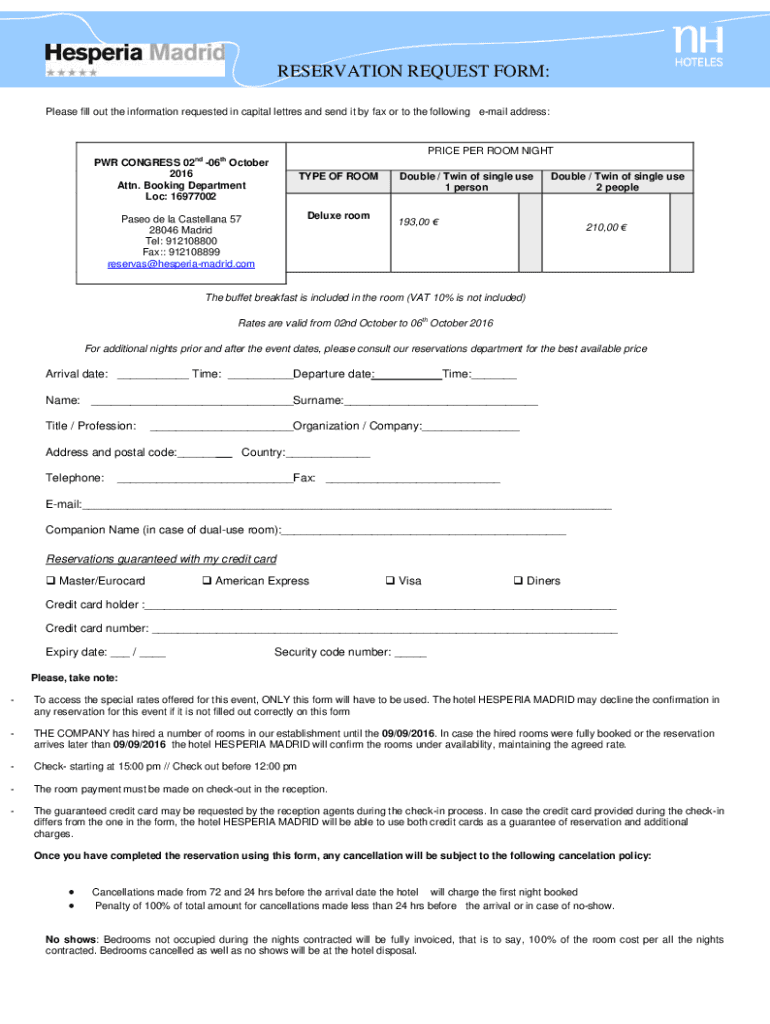 Please fill out the information requested in capital letters and send it by fax or to the following email address:PRICE PER ROOM NIGHT