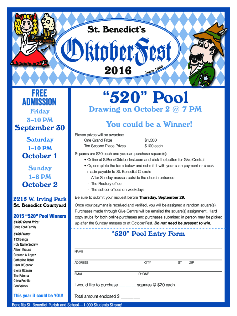 2016520 Outdrawing on October 2 7 PM Friday 310 You could be a Winner! September 30 Saturday 110 PM October 1 Sunday 18 PM October 2, 2215, W. Irving Park St. Benedict Courtyard2015 520 Pool Winners