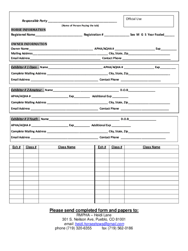 Responsible Party Official Use(Name of Person Paying the tab)HORSE INFORMATION Registered Name Registration # Sex M G S Year Foaled OWNER INFORMATION Owner Name ALPHA/AQUA # Exp Mailing Address City,
