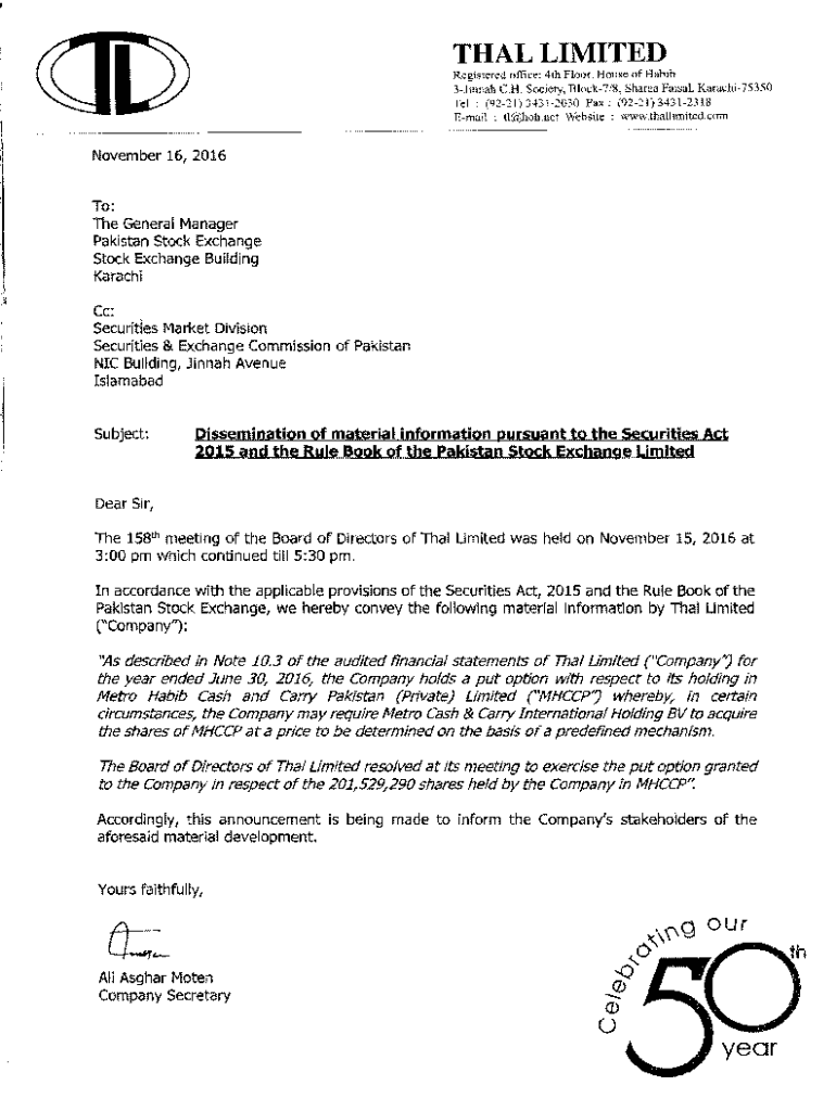 Get the free THAL LIMITED