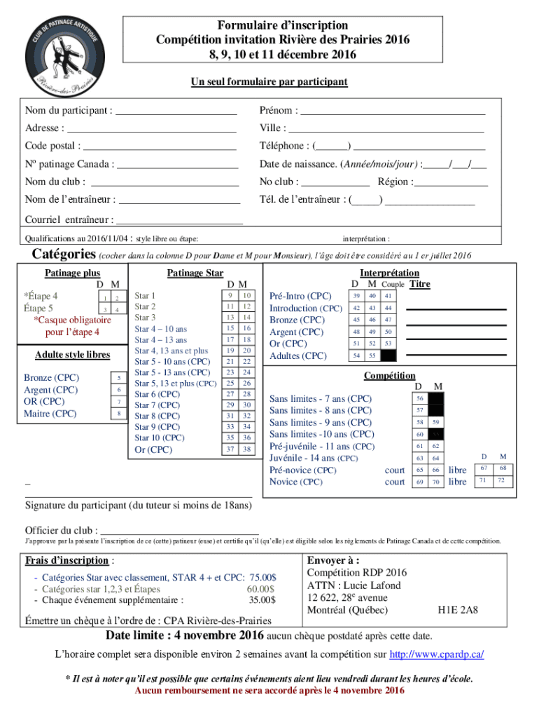 Formula ire inscription Competition invitation Riv ire DES Prairies 2016 8, 9, 10 ET 11 December 2016 UN sell formula ire par participant Not Du participant : Prom : Address : Villa : Code postal