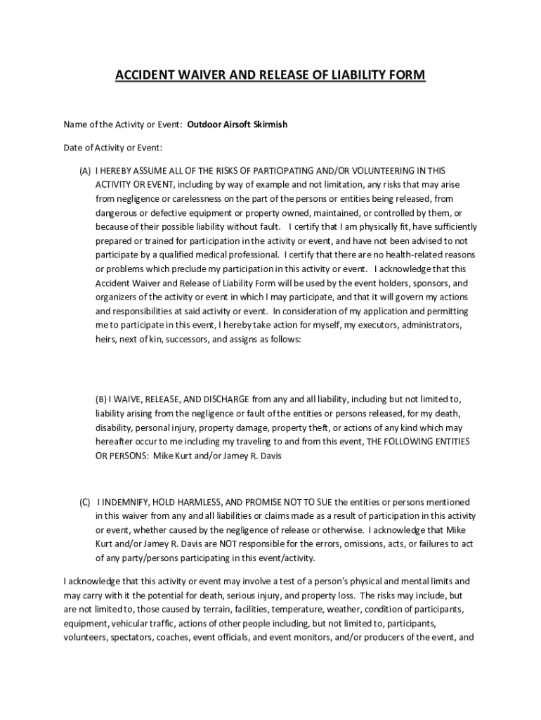 ACCIDENT WAIVER AND RELEASE OF LIABILITY Forename of the Activity or Event: Outdoor Airsoft Skirmish