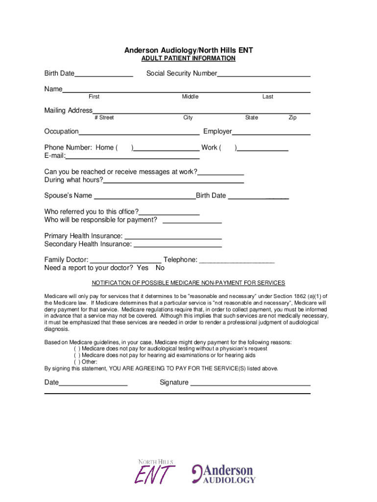 Anderson Audiology/North Hills ENT ADULT PATIENT INFORMATIONBirth Antisocial Security Cumbersome FirstMiddleLastMailing Address # StreetCityStateOccupationZipEmployerPhone Number: Home (Email:)Work