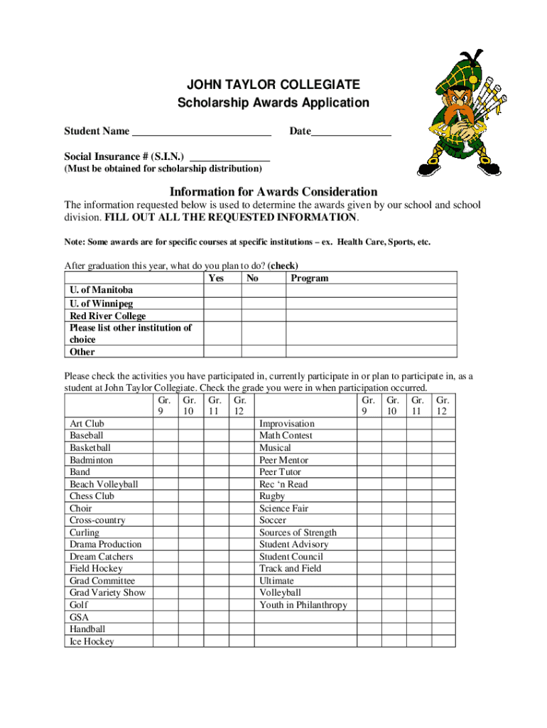 JOHN TAYLOR COLLEGIATE Scholarship Awards Application Student Name Date Social Insurance # (S.I.N.) (Must be obtained for scholarship distribution)Information for Awards Consideration The information
