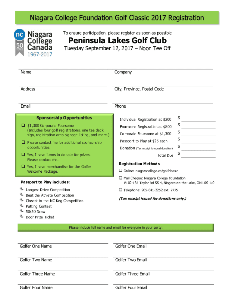 Niagara College Foundation Golf Classic 2017 Registration To ensure participation, please register as soon as possiblePeninsula Lakes Golf Club Tuesday, September 12, 2017, Noon Tee OffNameCompanyAddressCity,
