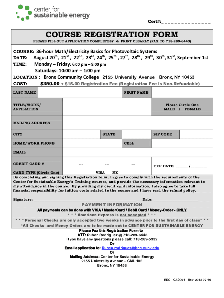 Cert#: COURSE REGISTRATION FORM PLEASE FILL OUT APPLICATION COMPLETELY & PRINT CLEARLY (FAX TO 7182896443)COURSE: 36hour Math/Electricity Basics for Photovoltaic Systems TH st ND rd TH st DATE: August