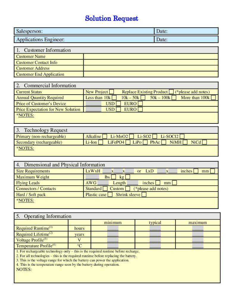 Solution Request Salesperson:Date:Applications Engineer:Date:1. Customer Information Customer Name Customer Contact Info Customer Address Customer End Application2. Commercial Information Current