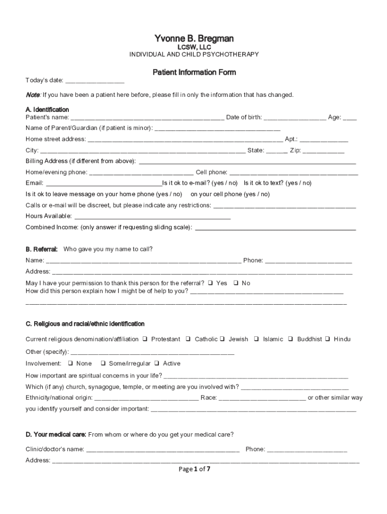 Yvonne B. Bregman LCSW, LLC INDIVIDUAL AND CHILD PSYCHOTHERAPYTodays date: Patient Information Footnote: If you have been a patient here before, please fill in only the information that has changed.