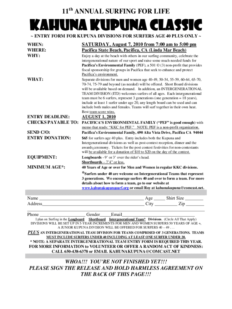 11th ANNUAL SURFING FOR LIFEKAHUNA KAHUNA CLASSIC ENTRY FORM FOR KAHUNA DIVISIONS FOR SURFERS AGE 40 PLUS ONLY SATURDAY, August 7, 2010, from 7:00 am to 5:00 when: WHERE: WHY:Pacifica State Beach,