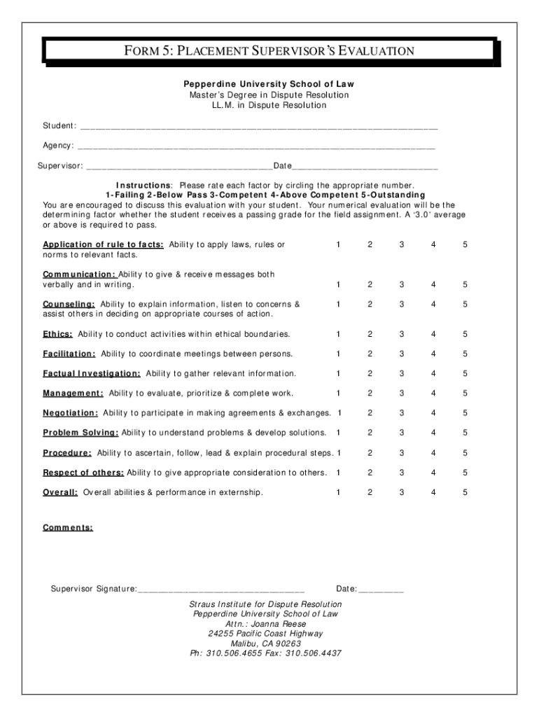 FORM 5: PLACEMENT SUPERVISORS EVALUATION Pepper dine University School of Law Master’s Degree in Dispute Resolution LL.M. in Dispute Resolution Student: Agency: Supervisor: Date Instructions: Please