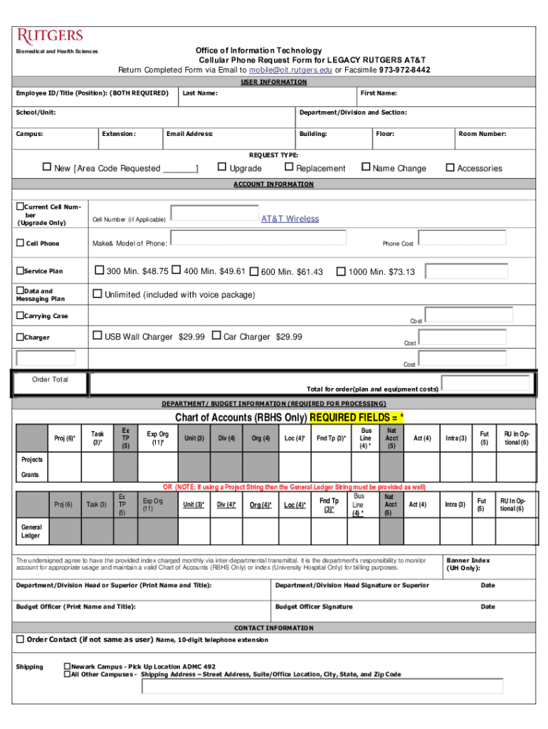 Office of Information Technology Cellular Phone Request Form for LEGACY RUTGERS AT&T Return Completed Form via Email to mobile OIT.Rutgers.edu or Facsimile 9739728442Biomedical and Health SciencesUSER