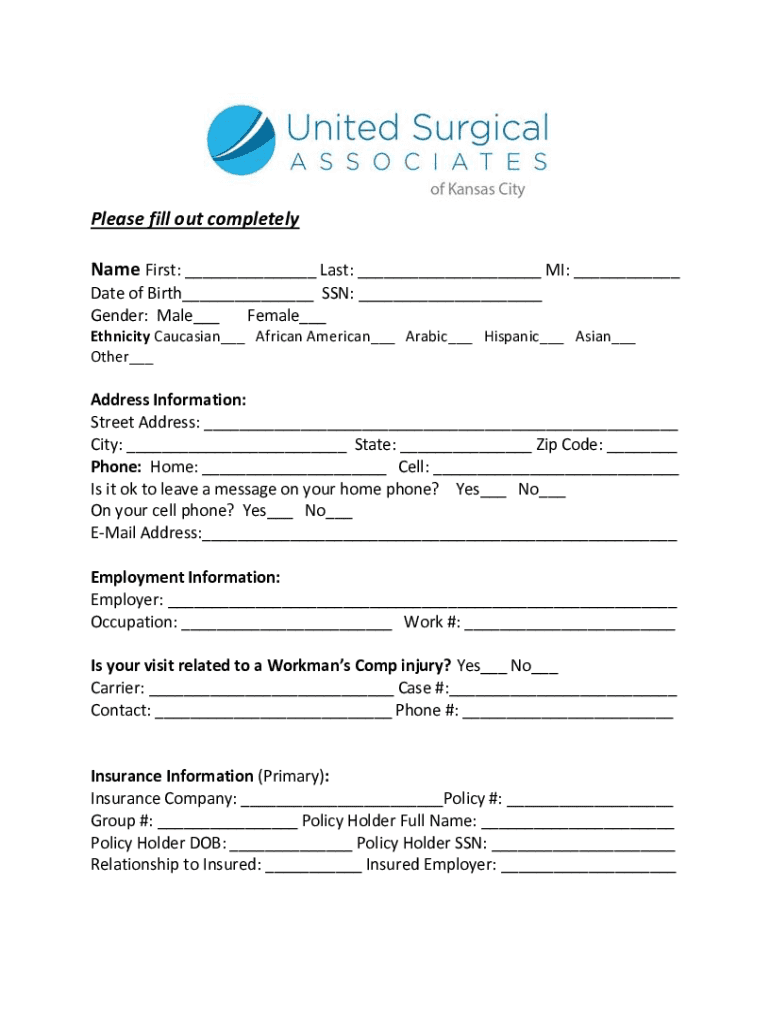 Please fill out completely Name First: Last: MI: Date of Birth SSN: Gender: Male Female Ethnicity Caucasian African American Arabic Hispanic Asian Other Address Information: Street Address: City: