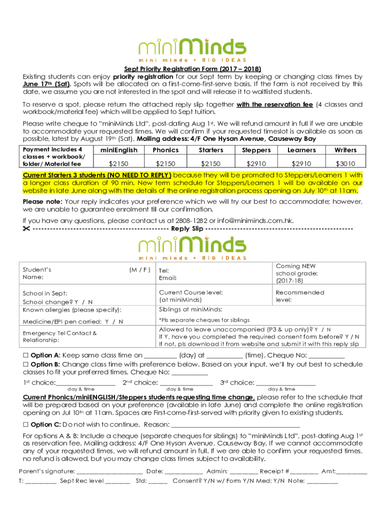 Sept Priority Registration Form (2017 2018) Existing students can enjoy priority registration for our Sept term by keeping or changing class times by June 17th (Sat). Spots will be allocated on a