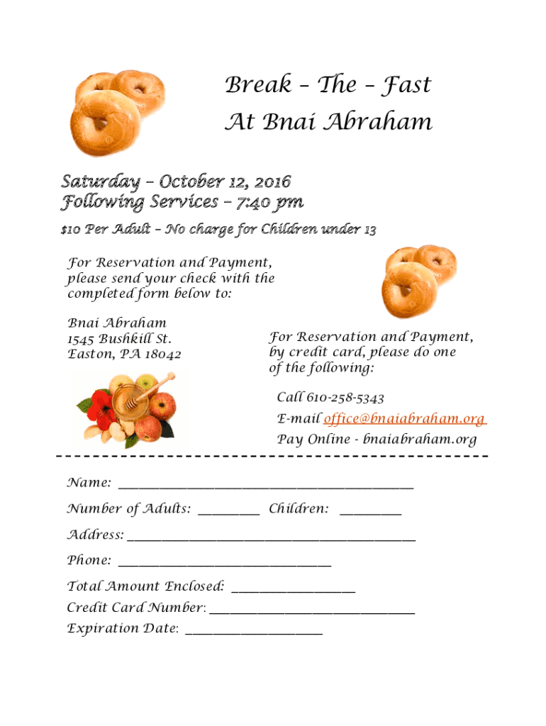 Break The Fast At Bani Abraham Saturday, October 12, 2016, Following Services 7:40 pm $10 Per Adult No charge for Children under 13 For Reservation and Payment, please send your check with the completed