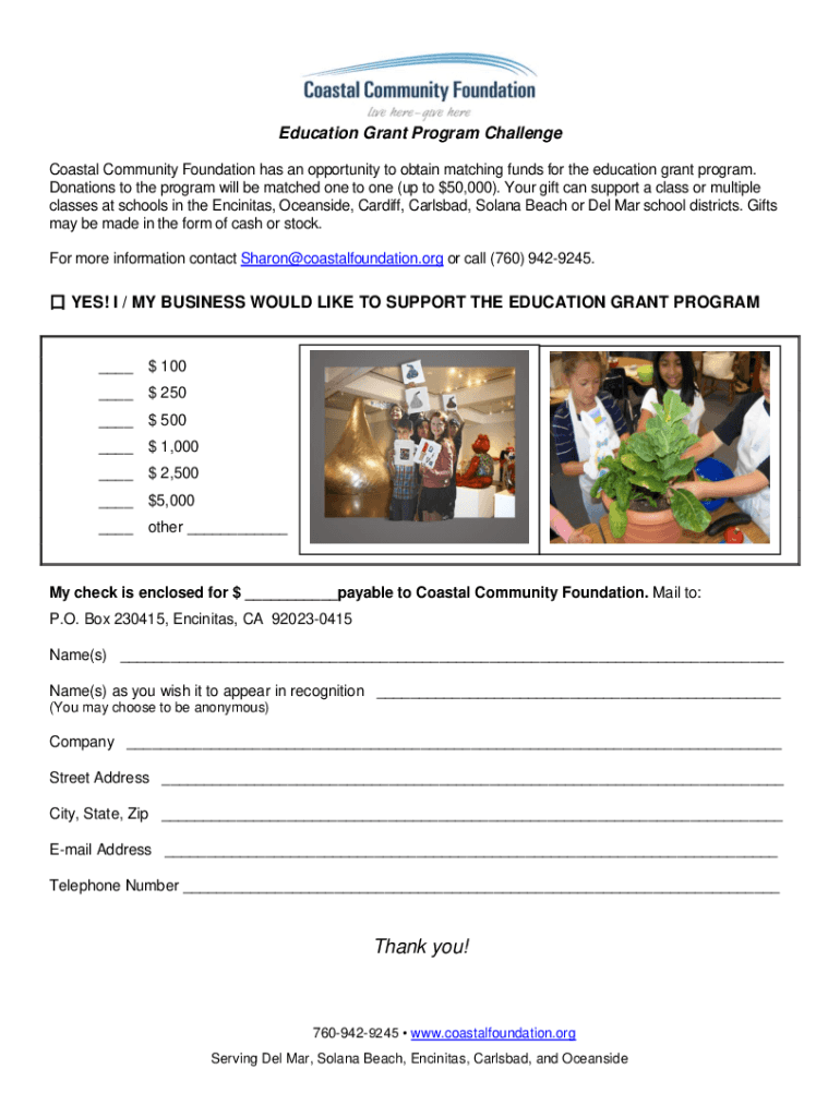Coastal Community Foundation has an opportunity to obtain matching funds for the education grant program.