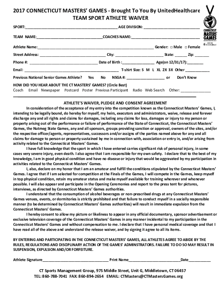 2017 CONNECTICUT MASTERS GAMES Brought To You By UnitedHealthcare TEAM SPORT ATHLETE WAIVER SPORT: AGE DIVISION: TEAM NAME: COACHES NAME: Athlete Name: Gender: Male Female Street Address: City: State: