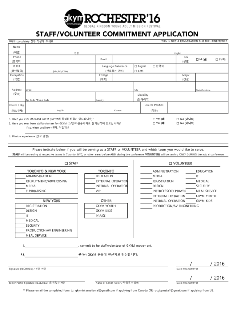 STAFF/VOLUNTEER COMMITMENT APPLICATION THIS IS NOT A REGISTRATION FOR THE CONFERENCE.***Fill completely Name ()PhoneEnglishSexEmail() D.O. Language Preference()()(MM/DD/YYY) English College Major()()()Streetcar()