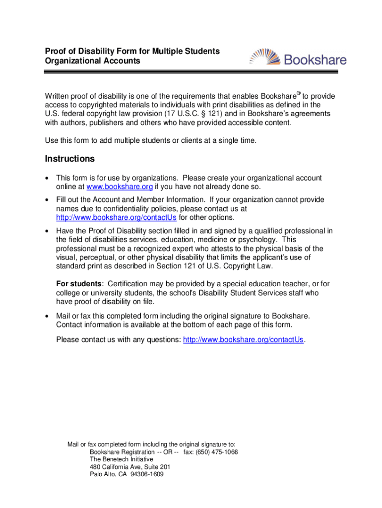 Proof of Disability Form for Multiple Students Organizational AccountsWritten proof of disability is one of the requirements that enables Book share to provide access to copyrighted materials to individuals