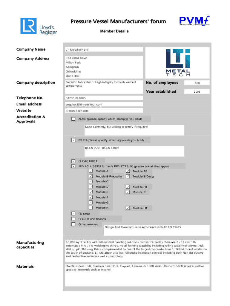 Pressure Vessel Manufacturers forum Member DetailsCompany Name LTI Metal tech Company Address163 Brook Drive Milton Park Abingdon Oxfordshire OX14 4SDCompany descriptionPrecision Fabricator of High