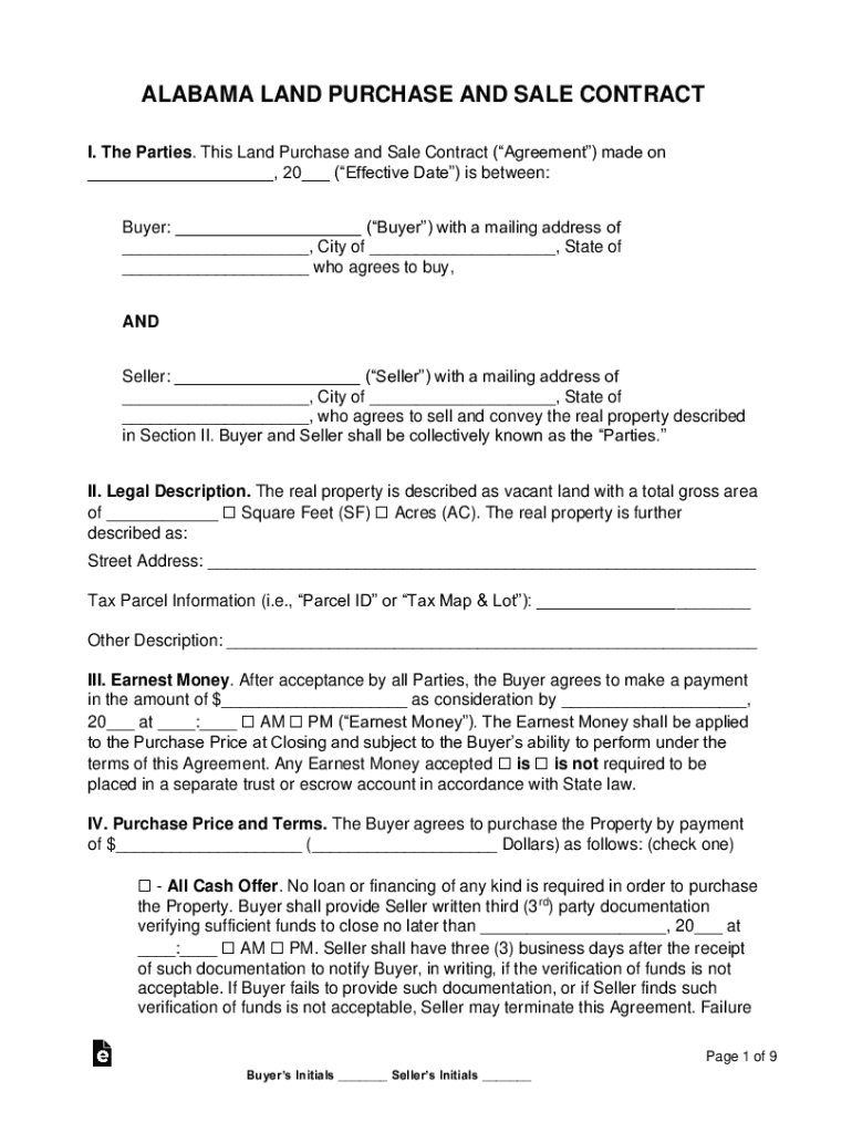 ALABAMA LAND PURCHASE AND SALE CONTRACT I. The Parties. This Land Purchase and Sale Contract (Agreement) made on, 20 (Effective Date) is between: Buyer: (Buyer) with a mailing address of, City of,
