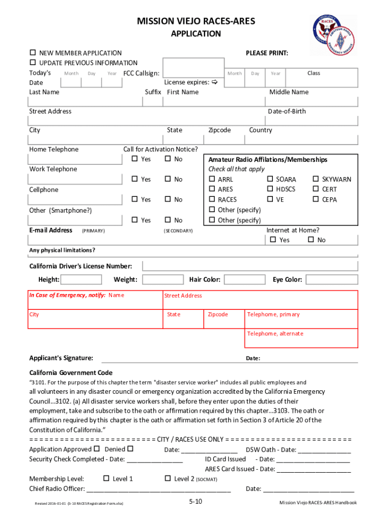 MISSION VIEJO RACECARS APPLICATION NEW MEMBER APPLICATION UPDATE PREVIOUS INFORMATION Today's Date Last NameMonthDayYearPLEASE PRINT:FCC Call sign:MonthDayLicense expires: Suffix First NameClassMiddle