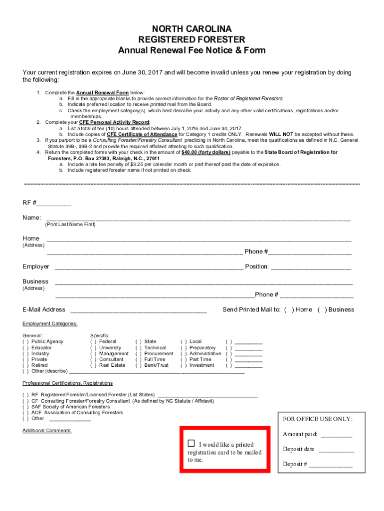 NORTH CAROLINA REGISTERED FORESTER Annual Renewal Fee Notice & Form Your current registration expires on June 30, 2017, and will become invalid unless you renew your registration by doing the following:
