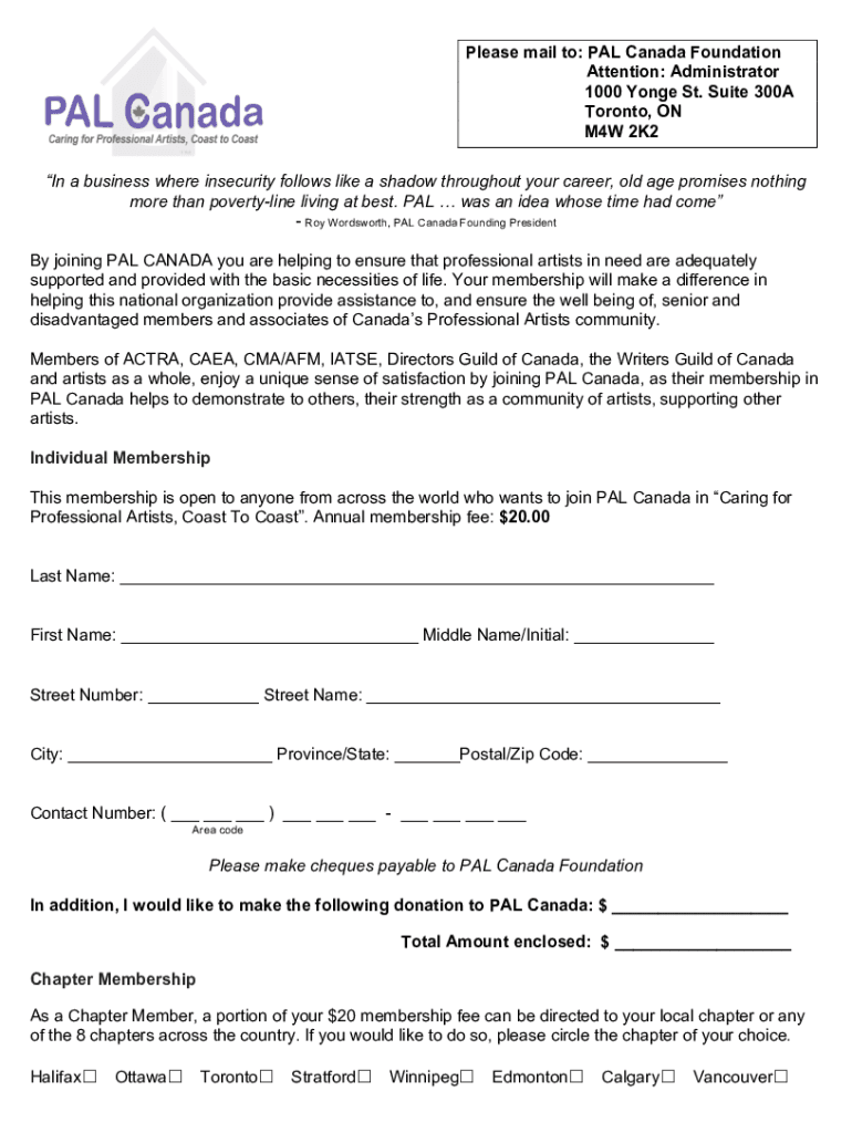 Please mail to: PAL Canada Foundation Attention: Administrator 1000 Yong St. Suite 300A Toronto, ON M4W 2K2 In a business where insecurity follows like a shadow throughout your career, old age promises