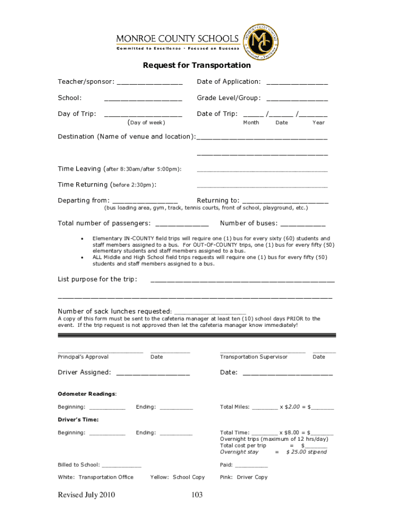 Request for Transportation Teacher/sponsor: Date of Application: School: Grade Level/Group: Day of Trip: (Day of week)Date of Trip: / / MonthDateYearDestination (Name of venue and location): Time