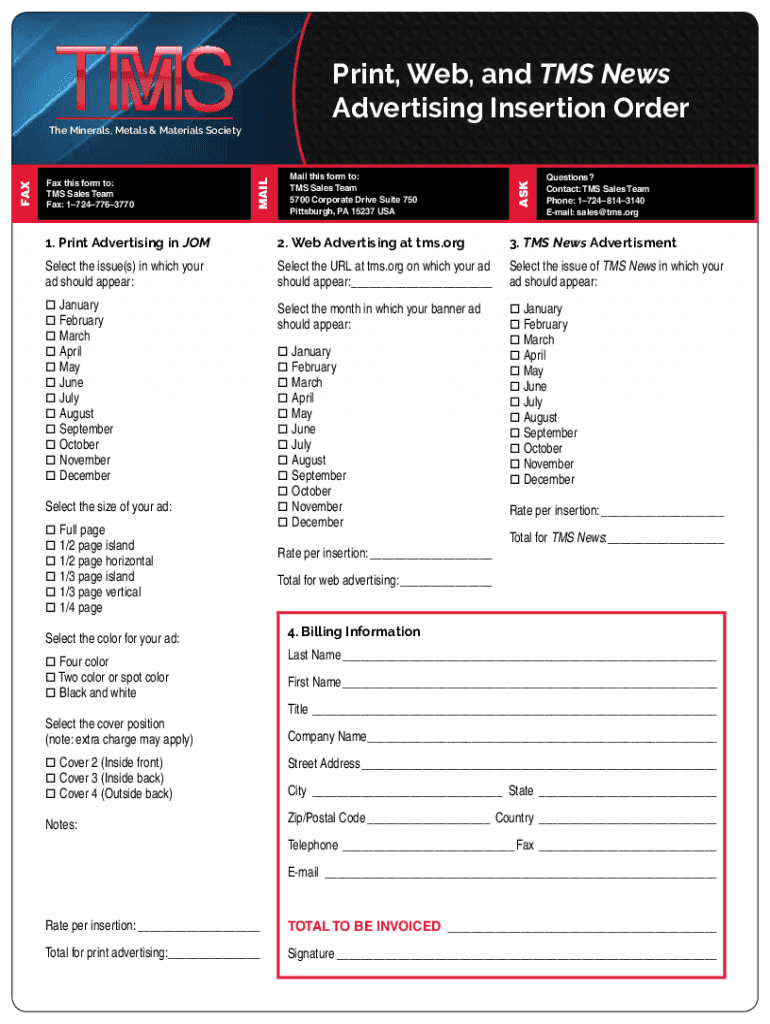 Print, Web, and TMS News Advertising Insertion Order Mail PA this15237 form to:USA P: 1724 7769000 F: 17247763770 Questions? Drive Suite 750 Pittsburgh, www.tms.org TMS Sales Team 5700 Corporate Drive