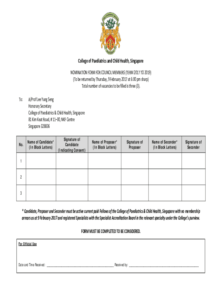 College of Pediatrics and Child Health, Singapore NOMINATION FORM FOR COUNCIL MEMBERS (TERM 2017 TO 2019) (To be returned by Thursday, 9 February 2017 at 6:00 pm sharp) Total number of vacancies to