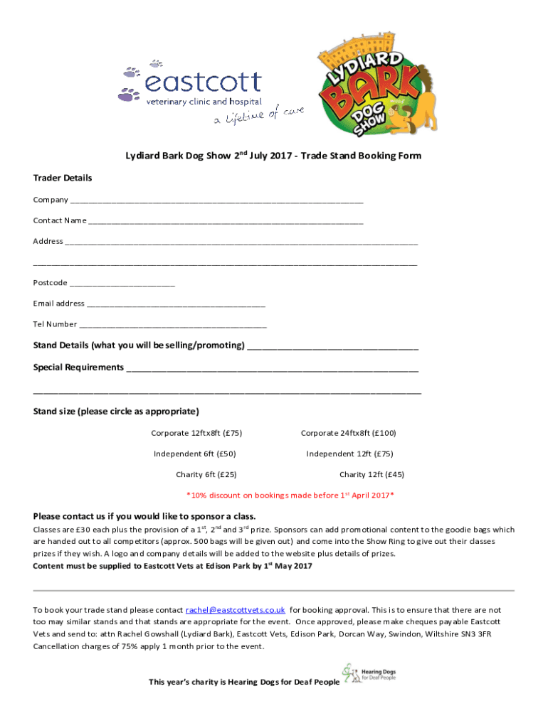 Lydia rd Bark Dog Show 2nd July 2017 Trade Stand Booking Form Trader Details Company Contact Name Address Postcode Email address Tel Number Stand Details (what you will be selling/promoting) Special