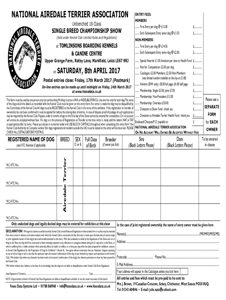 NATIONAL Airedale Terrier ASSOCIATIONENTRY FEES:Benched 18 Classing BREED CHAMPIONSHIP SHOW (held under Kennel Club Limited Rules and Regulations)Tomlinson BOARDING KENNELS & CANINE CENTREMEMBERS