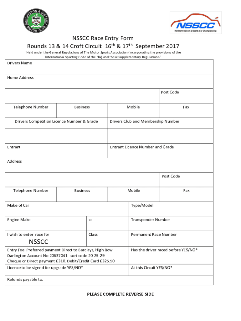 NS SCC Race Entry Form Rounds 13 & 14 Croft Circuit 16th & 17th September 2017 Held under the General Regulations of The Motor Sports Association (incorporating the provisions of the International