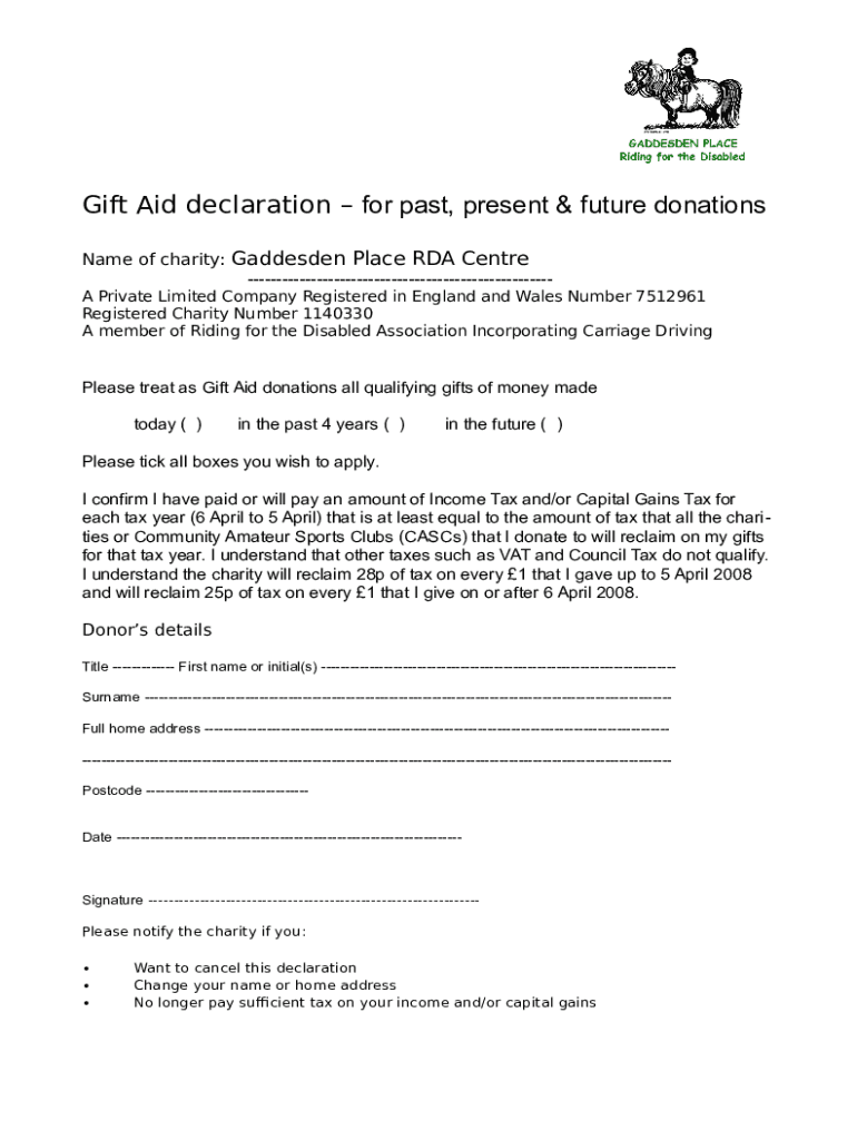 Gift Aid declaration for past, present & future donations Name of charity: Gadsden Place RDA Center A Private Limited Company Registered in England and Wales Number 7512961 Registered Charity Number