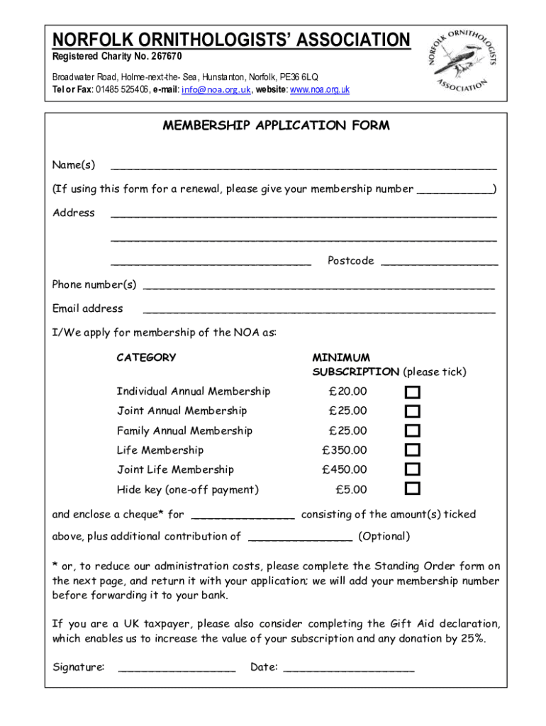 NORFOLK ORNITHOLOGISTS ASSOCIATION Registered Charity No. 267670Broadwater Road, Holmenextthe Sea, Huntington, Norfolk, PE36 6LQ Tel or Fax: 01485 525406, email: info NOA.org.UK, website: www.noa.org.ukMEMBERSHIP