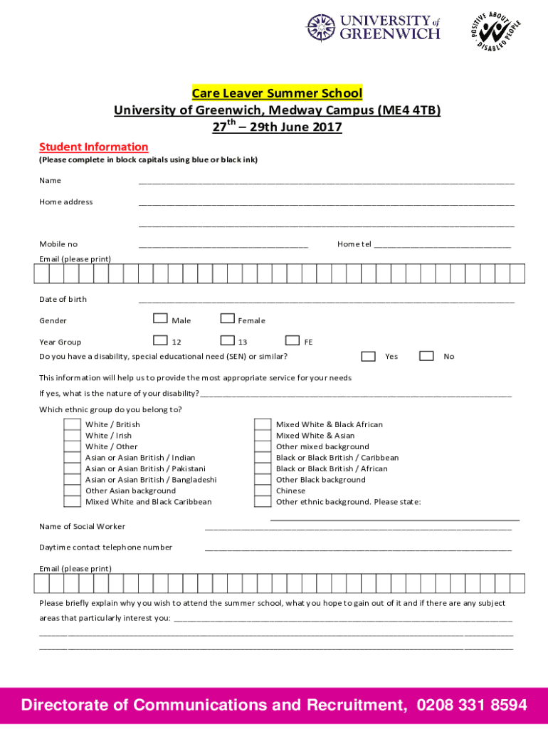 Care Leaver Summer School University of Greenwich, Midway Campus (ME4 4 TB) 27th 29th June 2017 Student Information (Please complete in block capitals using blue or black ink) Name Home address Mobile