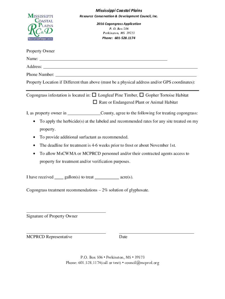 Mississippi Coastal Plains Resource Conservation & Development Council, Inc. 2016 Congress Application P. O. Box 506 Perkins ton, MS 39573 Phone: 601528.1174Property Owner Name: Address: Phone Number: