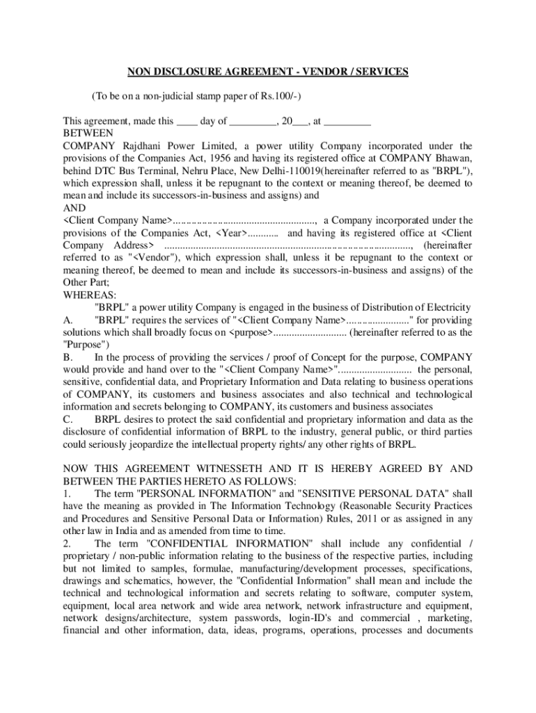 NON DISCLOSURE AGREEMENT VENDOR / SERVICES (To be on a nonjudicial stamp paper of Rs.100/) This agreement, made this day of, 20, at BETWEEN COMPANY Radiant Power Limited, a power utility Company incorporated